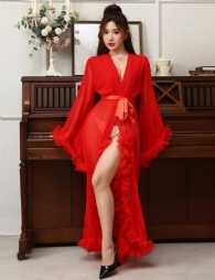 Product Name Red Sexy Mesh Ruffled Long Robe With Belt
