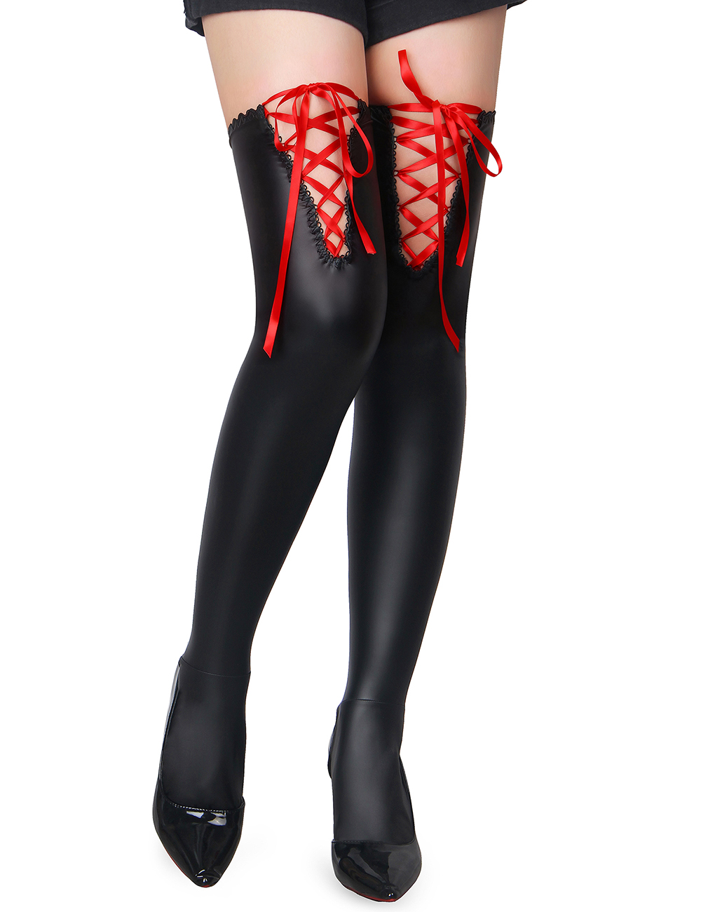 Product Name Black Sexy PU Leather Stockings With Red Cross Straps