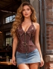 Standard Product Name: Available in black and coffee colors, faux leather + printed fabric, paired with metal chains, rivets, and metal rings, center front zipper design, center back lace design, adjustable bust, adjustable halter, 14 soft bones, bust pad, size S-7XL, vintage trendy leather printed bodysuit.