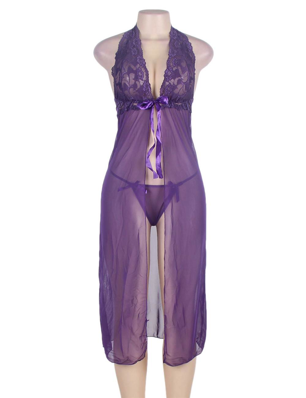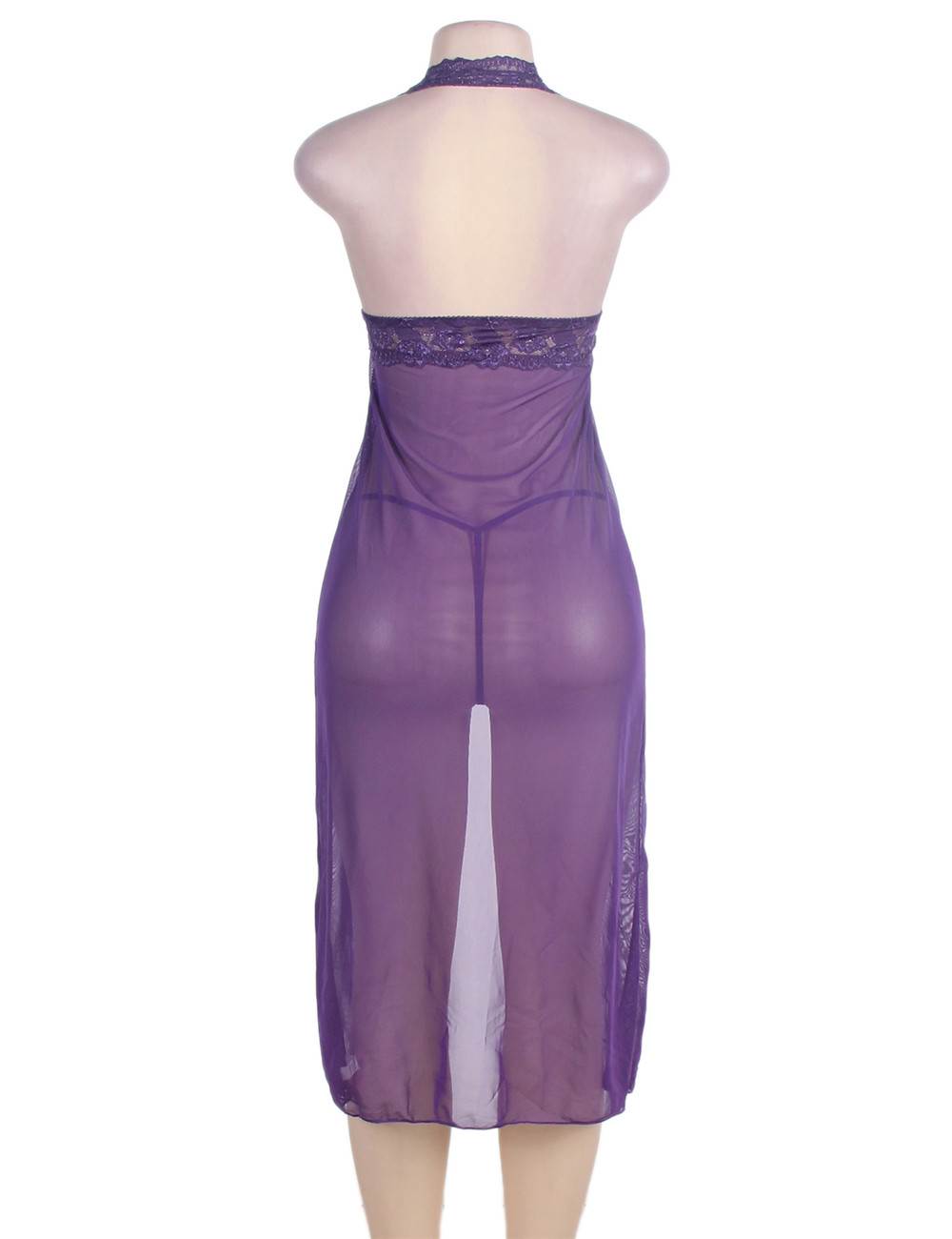 Home > Babydolls > Sexy Purple Halter Lace Tops Open Back Long Babydoll Dress